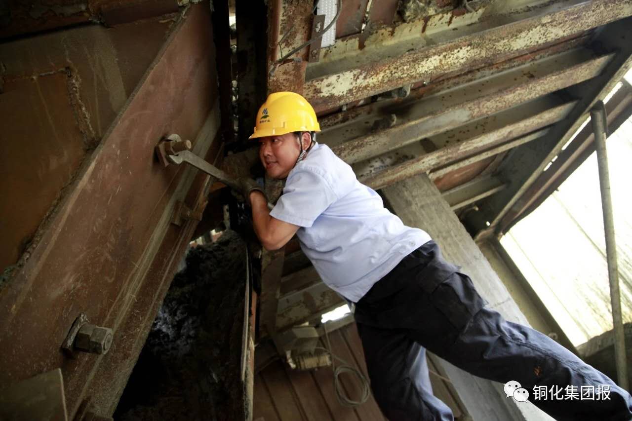 下了皮帶廊,走到主井礦倉下,老郭自豪地指著頭頂上方:“8個漏斗,過去維修和更換都是委外,現(xiàn)在都是我?guī)俗约焊伞《嗌馘X我不曉得,自己的事情就該自己干,能省一個是一個!”說到興奮時,他還掏出手機上圖片給我講2個月前他們打的一場硬仗:主井35米礦倉漏斗因礦石提運沖擊導致四邊混凝土嚴重磨損,礦業(yè)公司聽取老郭的建議,準備為漏斗四邊安裝4塊鋼板以保護受損的混凝土墻體。為了最大限度減少對主井出礦的影響,只給他們48小時的停產時間。頭一次接這大活的老郭也沒犯怵,提前準備好鋼板、木條等材料,將8名維修工分成3班,白班和小夜班清漏斗、制作安裝安全護板、鑲嵌鋼板,大夜班專門焊接鋼板??辛?天的方便面,提前2小時完工將漏斗交付使用……