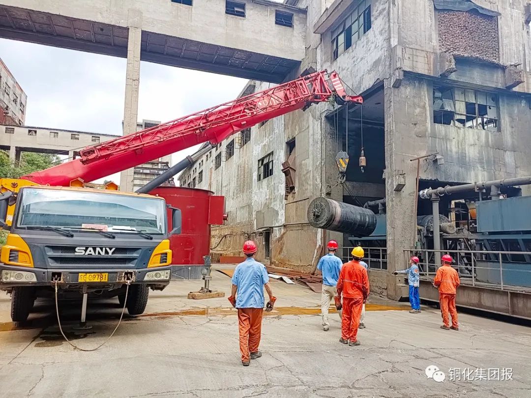 圖①:磨浮車間維修人員吊起磁滾桶,維修磁選機(jī)。