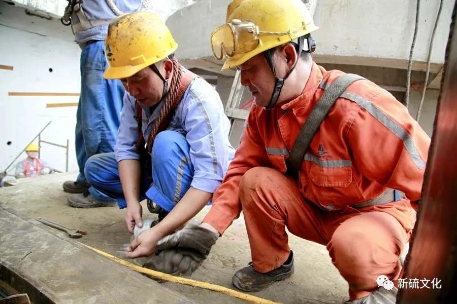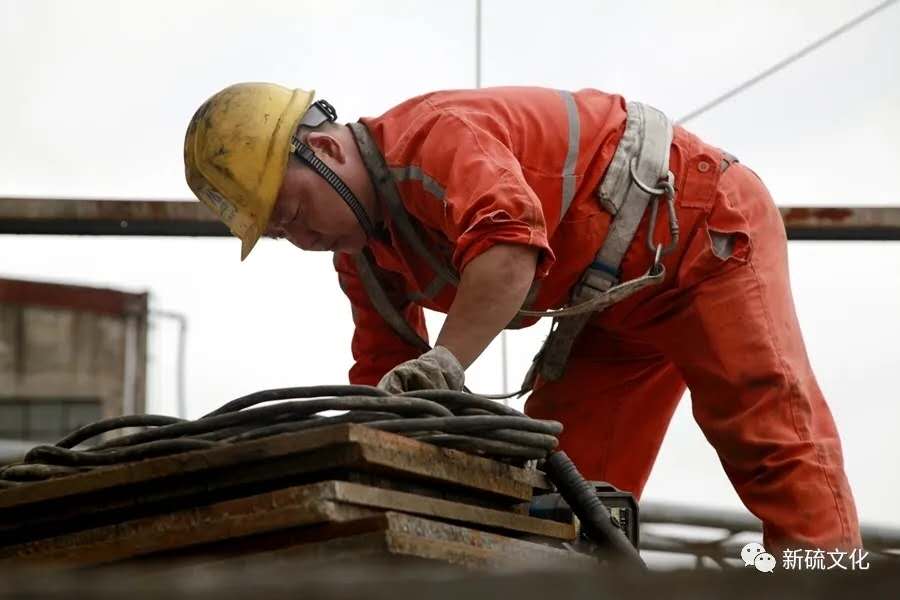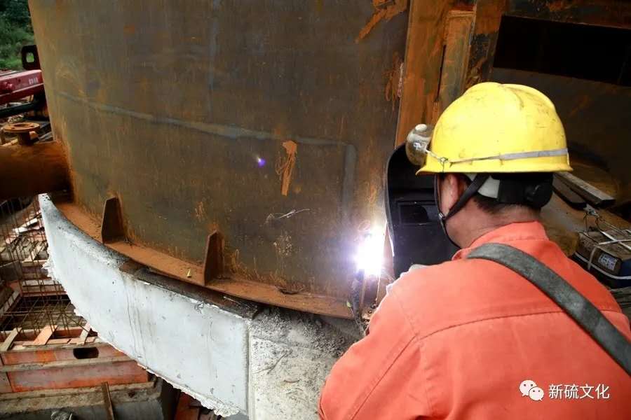 地面上大吊車、大貨車,選礦廠相關負責人、技術人員、安全員等忙著起吊龐然大物時,“焊高組”在底座上也一刻沒閑著,拖運電焊設備、準備焊接材料、在底座上鋪水泥保持平面,各個槽體支腳找平衡......由于底座緊挨著磨浮車間,空氣不流通,加上天氣悶熱難擋,武裝整齊的好“焊”們一會就汗?jié)窳斯ぷ鞣?,汗珠順著安全帽壓著的發(fā)根往下滾。